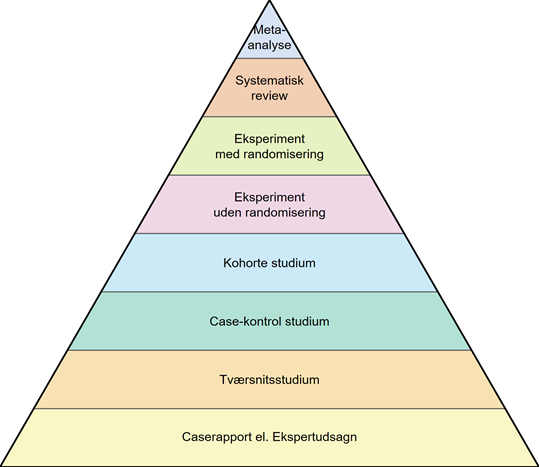 Figur 1. Evidenspyramide, hvor der generelt set tillægges højere kvalitet med stigende niveau i pyramiden.