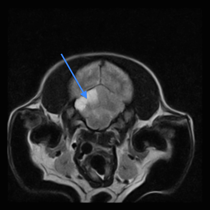Thalamusinfarkter udgør tilsyneladende en relativt stor andel af infarkterne hos hunde 6,25,26. Thalamus forsynes af flere forskellige perforerende arterier, og symptomatologien hos hunde omfatter – lidt afhængigt af hvilken perforerende grenarterie der er ramt – både vestibulære symptomer som nystagmus, skæv hovedholdning og strabismus samt forventelige symptomer relateret til læsioner i forhjernen såsom nedsat postural funktion, hemiparese, cirklen, hoveddrejning og nedsat menace respons25,26. De vestibulære symptomer er kun rapporteret ved paramediane infarkter. Årsagen hertil er formentlig, at den arterie, der forsyner den caudomediale del af thalamus, også løber til pons og midthjernen, hvorfor disse også vil afficeres. Eventuelle forhjernesymptomer kan ses ved både paramediane-, dorsalekstensive- og ventrolaterale infarkter og afspejler thalamus’ rolle som relæstation mellem hjernestammen og cerebrale cortex.