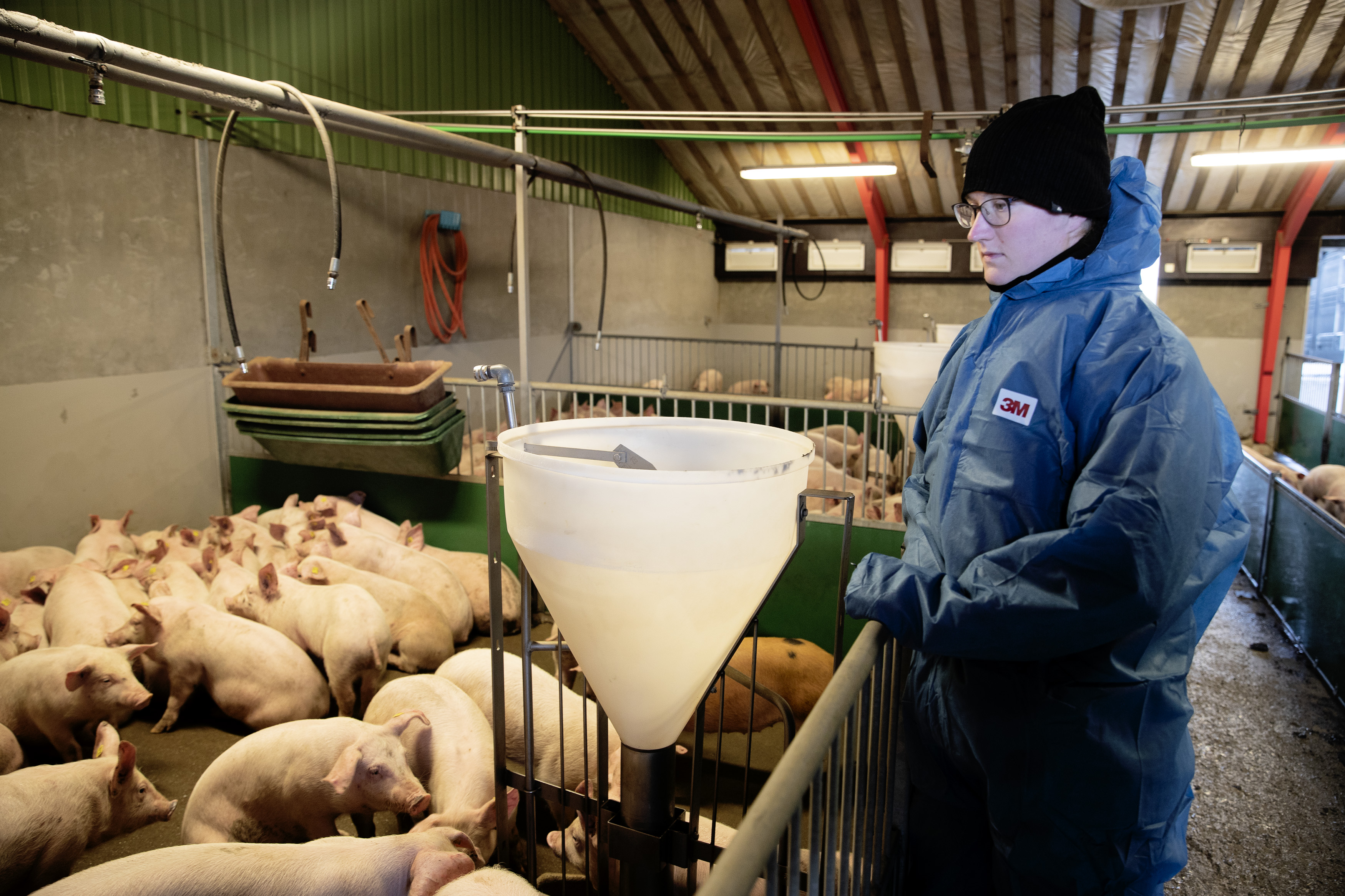 Dyrlægerne følger koncentreret hver eneste gris med øjnene, mens dyrene aflæsses. Især hvis de efterfølgende skal direkte op i en eksportvogn, er det om at være på mærkerne. Denne sending grise skal vente en rum tid på samlestedet, inden de afhentes af eksportbilen. De er nu ikke kun i uvante omgivelser, mens de venter på at blive omlæsset. De er også blevet blandet godt og grundigt sammen. Selv om de er fra samme besætning, befinder de sig blandt ukendte artsfæller. Det fører en hel del uro med sig. Flere af grisene slås indbyrdes og har hudafskrabninger på ørene.