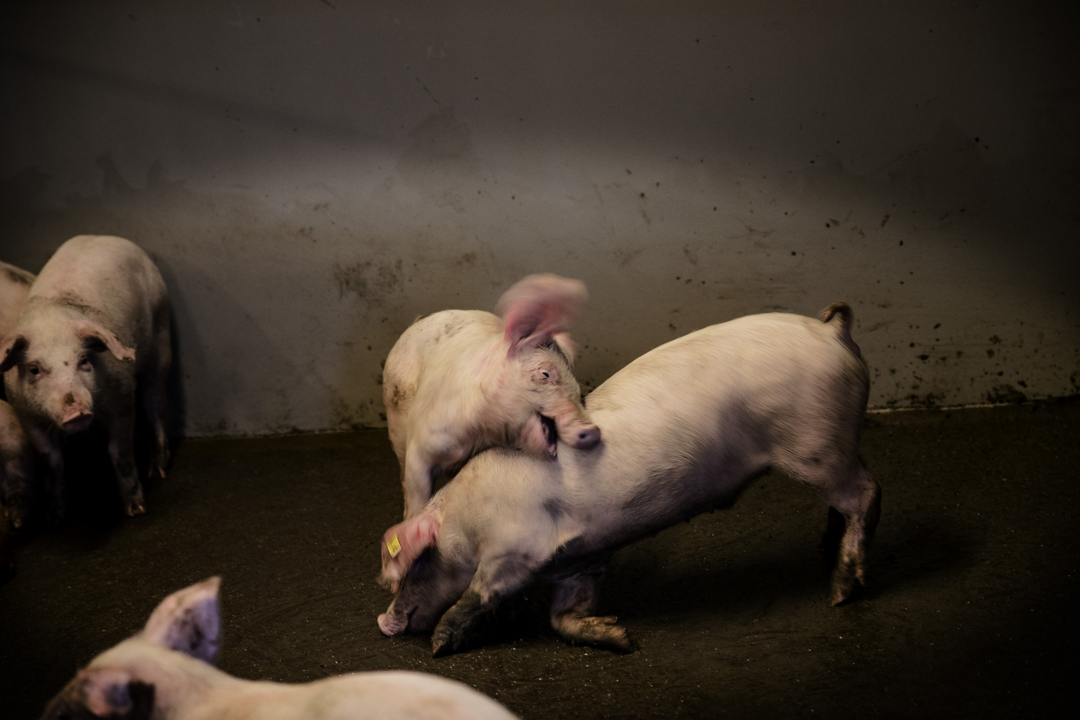 Chaufføren bliver bedt om at genne den ind i den sti, hvor de frasorterede grise samles og senere aflives af samlestedets personale. I en anden, blodplettet sti står yderligere tre svin – alle med tydelig rektalprolaps.