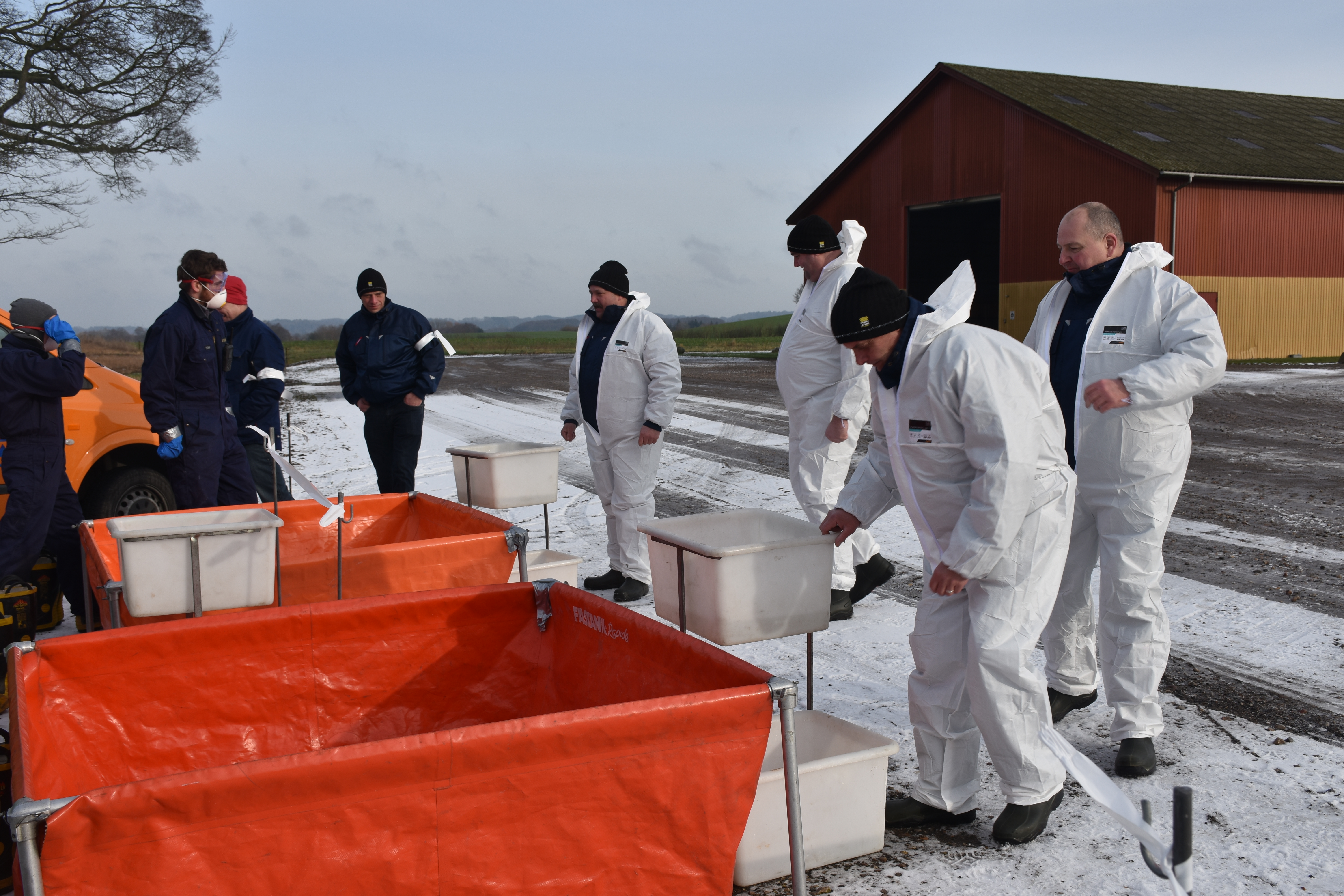 Alle er klar til at gøre hvert sit. Men heldigvis er det bare en øvelse som en del af den fire dage lange test af Danmarks veterinære beredskab – om det virker optimalt, hvis landet en dag rammes af afrikansk svinepest.