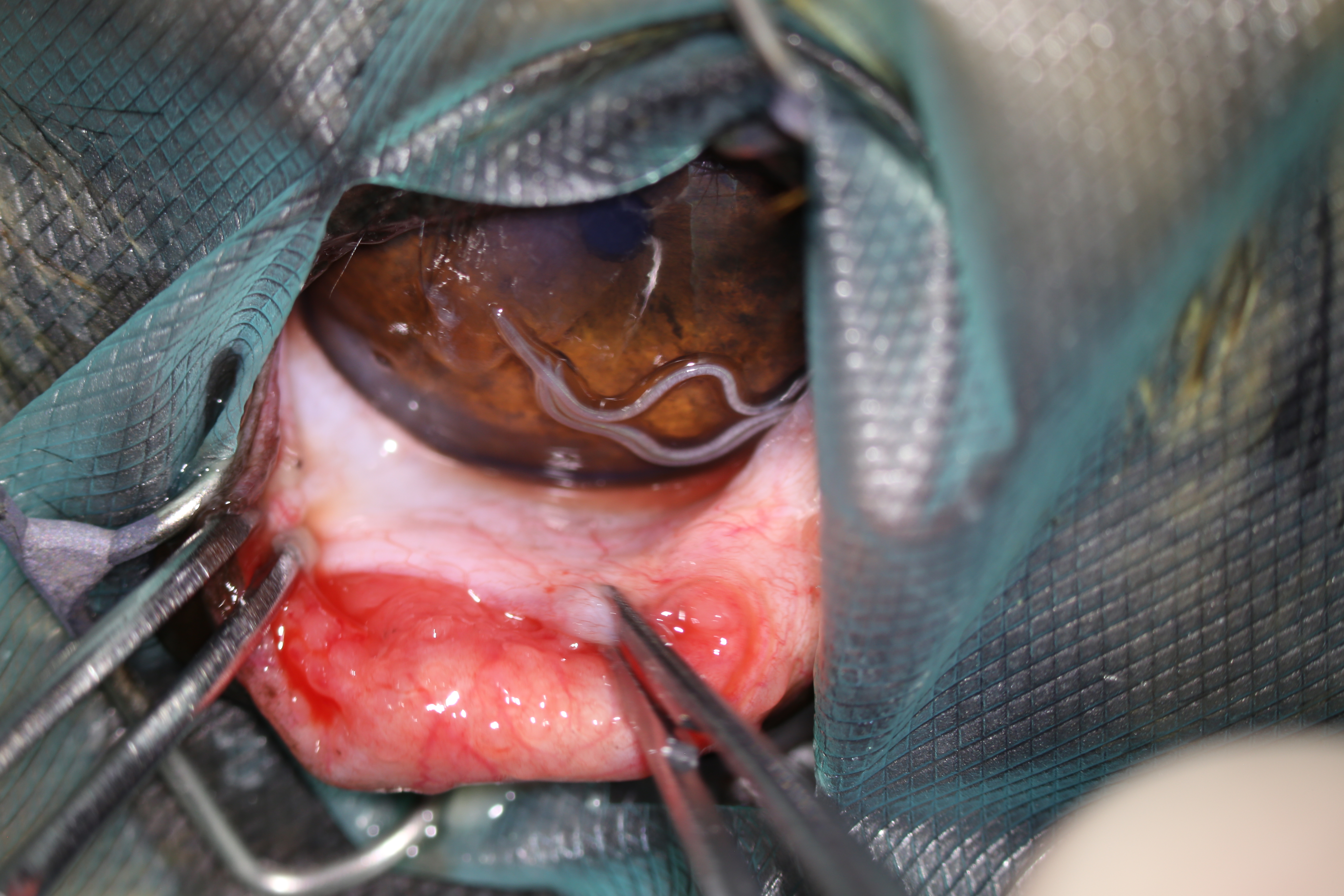 Behandling for øjeorm blev foretaget i fuld inhalationsanæstesti efter standardpræmedicinering med carprofen, metadon, dexmedetomidine, acepromazine og induktion med propofol. Under operationsmikroskop blev fire orme derefter fjernet manuelt fra konjunktiva OD. Ved inspektion af OS fandtes også her orm (2 stk.), der ligeledes blev fjernet. OD blev herefter forberedt rutinemæssigt til kirurgisk behandling, og der blev foretaget debridement af løst korneaepithel med skalpelblad Beaver 6400.