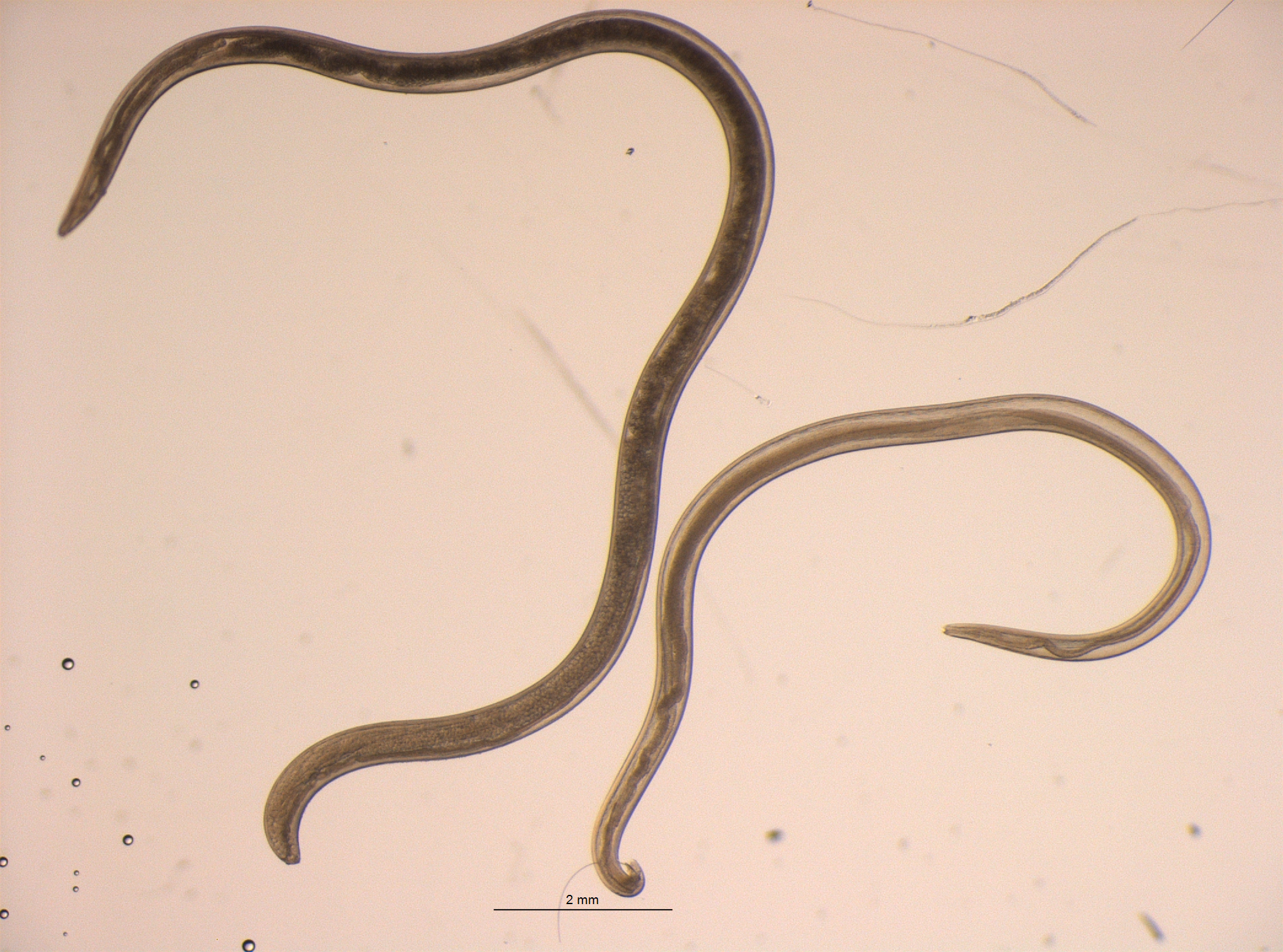De isolerede orm blev opklaret i mælkesyre (10 %), og ormene fandtes ved mikroskopi at bestå af kønsmodne hanner og hunner (Figur 3). Ormens kutikula er forsynet med karakteristiske fine, tværgående striber og i forenden ses en tydelig kop-formet mundkapsel (ca. 23 µm dyb) (Figur 4). Hannerne havde i bagenden to spikler af meget forskellig længde (140 vs. 1.800 µm). Hunnerne indeholdt levende larver (de er levendefødende), som målte omkring 200 µm. Kønsåbningen fandtes karakteristisk ikke i bagenden, men helt foran ved overgangen mellem oesophagus og tarmen (Figur 4).