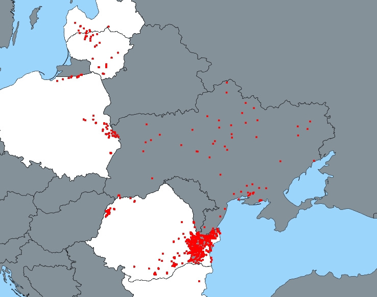 Figur 5. ASF udbrud i Rumænien. Der er et enkelt kluster af udbrud i det nordvestlige hjørne, mens hovedparten af udbruddene ligger i den østlige del af landet.