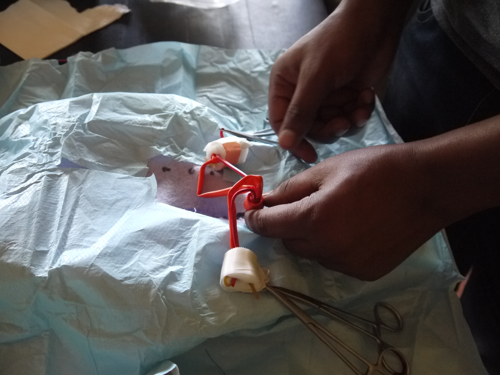Første dag i campen holdes en lille konference, hvor projektet og workshoppens forløb gennemgås, hvorefter de studerende demonstrerer deres kirurgiske færdigheder på en hjemmebygget spay-simulator, The SimSpay (3) (Fig 1.). Dette gør det muligt for vejlederne at inddele de studerende i hold, hvor de kan sikre, at mindst én har et godt overblik og kan støtte den anden. Små skønhedsfejl kan ligeledes nå at blive rettet, inden de studerende i de efterfølgende seks dage skal foretage proceduren på masaiernes hunde.