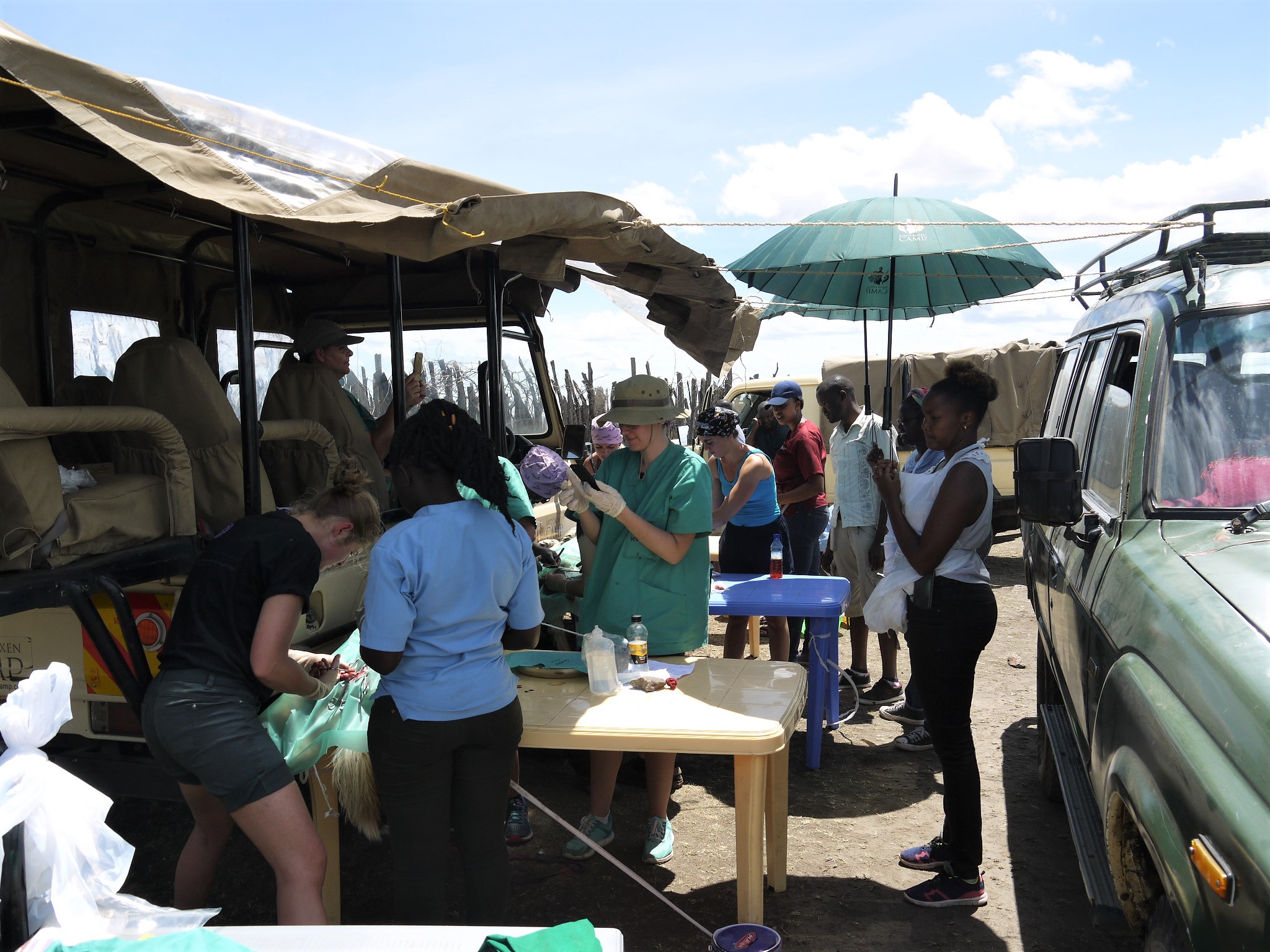 Workshoppens sjette dag er en oplevelse i sig selv, idet hele holdet forlader klinikken og i stedet drager i firehjulstrækkere ud på savannen. Herude, langt fra Mararienda by, ligger spredte bomaer, hvor én eller to familier bor med deres kvæg og hunde. På forhånd har MNCDog project aftalt med familierne, at vi kommer i løbet af dagen og kastrerer deres hanhunde. De tre firehjulstrækkere bliver stillet op ved bomaen, således at der kan spændes en presenning ud mellem dem for at skabe skygge. De to campingborde bliver placeret i skyggen, en scrub-in-station organiseres på bagsiden af den ene bil, og en »steril-central« til kogning af instrumenter indrettes bag en anden (Fig. 11 og 12).