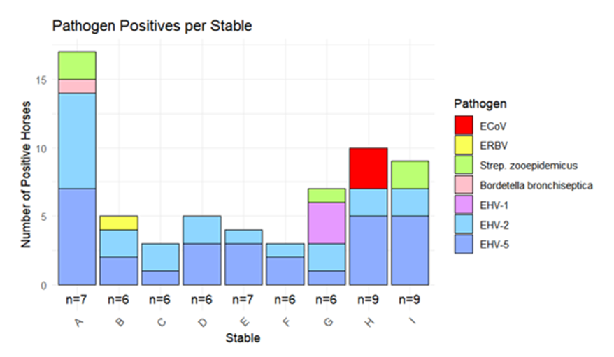 Generelt blev der fundet EVH-2 og EHV-5 i alle stalde, mens de resterende patogener kun var til stede i nogle stalde, og disse inkluderede ECoV, EHV-1, ERBV, Streptococcus equi subsp. zooepidemicus og Bordetella bronchiseptica.
