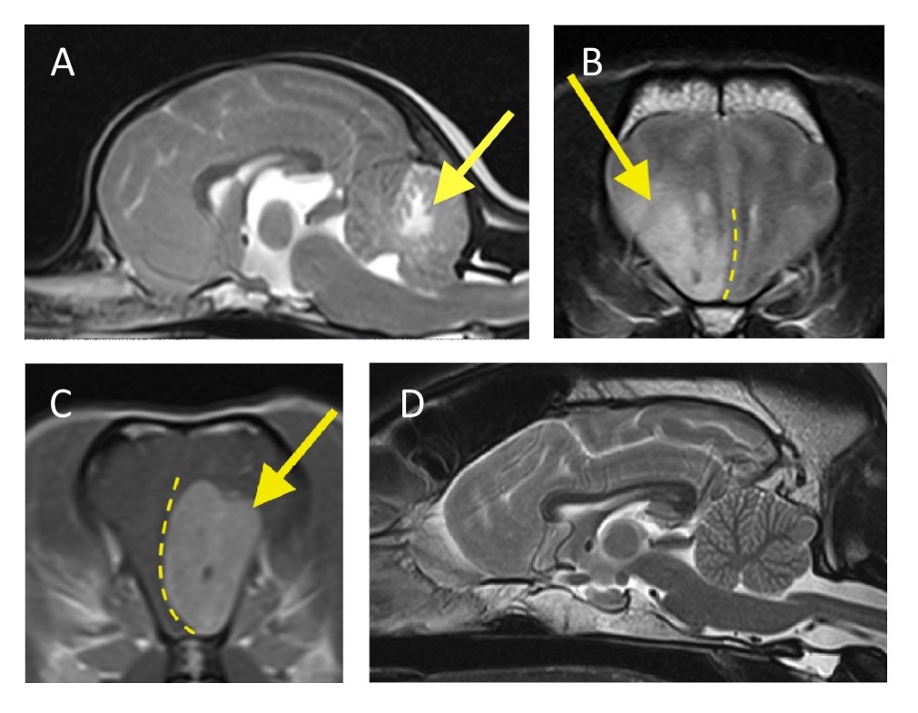 Figur 1. Eksempler på MR-fund. A) T2-vægtet længdesnit. Rostralt er til venstre i billedet. I cerebellum ses en hyperintens intra-axial læsion (pil), primært i den hvide substans. Patienten havde to lignende læsioner i cerebrum (ikke vist her). Den primære MR-diagnose var meningoencephalitis af ukendt oprindelse (MUO). Diagnosen blev bekræftet ved post mortem histopatologi. B) T2-vægtet tværsnit. Patientens højre side er til venstre i billedet. I højre frontallobe ses en hyperintens intra-axial læsion (pil). Læsionen har en diffus kontur og involverer især den grå substans. Den displacerer højre frontallobe over midtlinjen (stiplet linje). Den primære MR-diagnose var neoplasi, f.eks. gliom, hvilket blev bekræftet ved post-mortem histopatologi. C) T1-vægtet tværsnit, post-kontrast. Patientens højre er til venstre i billedet. I området ved venstre frontallobe ses en veldefineret, oval, extra-axial læsion (pil). Læsionen er hyperintens pga. kontrastforstærkning og displacerer midtlinjen mod højre (stiplet linje). Den primære MR-diagnose var meningiom. D) T2-vægtet længdesnit. Upåfaldende MR-scanning.