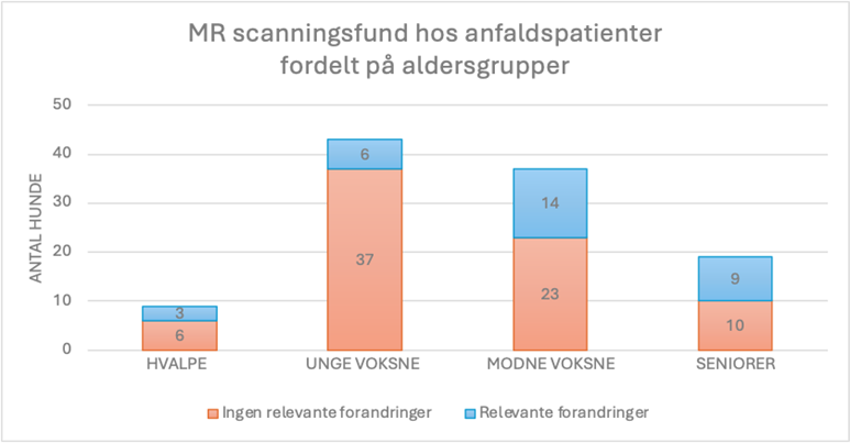 Anfald sås hos 108 af hundene (66 %) og var det hyppigst forekommende kliniske tegn. Af disse var 8 % hvalpe, 40 % unge voksne, 34 % modne voksne og 18 % seniorer. I alt blev der identificeret relevante MR-forandringer hos 30 % af anfaldspatienterne. Fordelt på aldersgrupperne sås forandringer i 33 % af hvalpene, 14 % af de unge voksne, 38 % af de modne voksne og 47 % af seniorerne (figur 2).