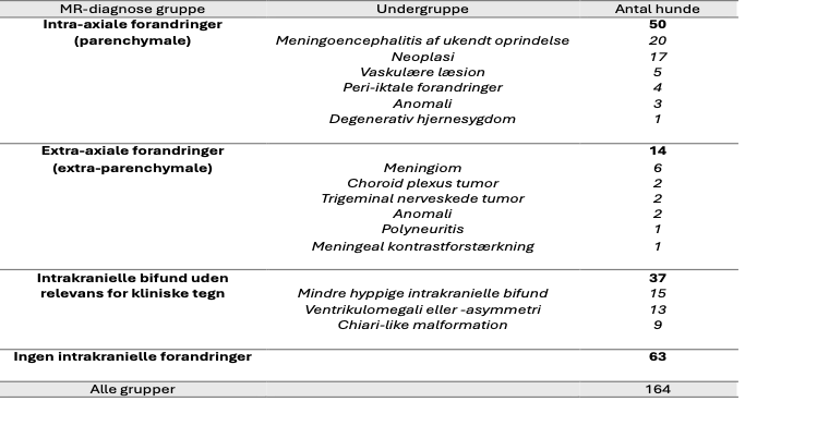 Tabel 1. MR-diagnoser på hunde (n=164) med tegn på intrakraniel sygdom, der fik foretaget MR-scanning af hjernen i studieperioden.