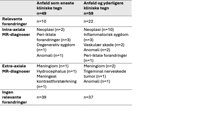 40 % af de MR-skannede hunde viste sig at have strukturelle intrakranielle forandringer af relevans for symptombilledet. De hyppigste MR-diagnoser var MUO, intra- og extra-axial neoplasi. I forhold til hunde med kun ét klinisk tegn havde hunde med mere end et klinisk tegn oftere MR-forandringer.