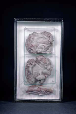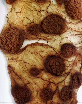 Præparattekst: »Infektiøs Abort. Et stykke ad de ødematøse hinder. Stærk Karfyldning, Trevlerne paa Fosterkagerne gullige, degenererede. Placenta, Ko. Fra Prof. Dr. Bang, 1900.« (Foto Jens Wejs).