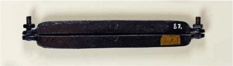 Brokklemme af jern med træbelægning udført af instrumentmager P. Melbye efter Stockfleths anvisning i 1859. Tidligere var behandling af brok en vanskelig opgave, og Stockfleth var en af de første, der for alvor tog udfordringen op. Han havde en stor interesse i behandling af de forskellige brokformer hos heste. Gennem tiden har han skrevet adskillige artikler og beskrivelser af behandlinger med mere eller mindre vellykkede resultater (6,7,8,9). (Foto Jens Wejs).
