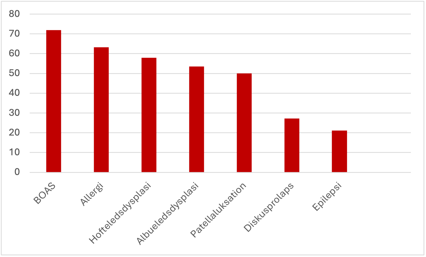 De emner, som dyrlægerne i henhold til besvarelserne rådgav mest om, var ikke overraskende vaccination, parasitbehandling, ernæring og neutralisation. Avl og reproduktion blev mindre ofte bragt op, hvilket er en naturlig følge af, at det kun er relevant for den relativt lille del af klienterne, som opdrætter hunde. Respondenterne blev bedt om at angive, hvor ofte de selv tog initiativ til at tale om avl, når de havde stillet en specifik diagnose på en hund (figur 1). Det fremgik, at BOAS (Brachycephalic Obstructive Airway Syndrome) var den diagnose, der hyppigst førte til en dialog om hundens fremtid som avlsdyr (n = 82; 72 %), mens det kun skete ved en ud af fem epilepsidiagnoser (n = 24; 21 %). Det kan der være flere grunde til, herunder at det langt fra er alle former for epilepsi, der kan antages at have en arvelig ætiologi.
