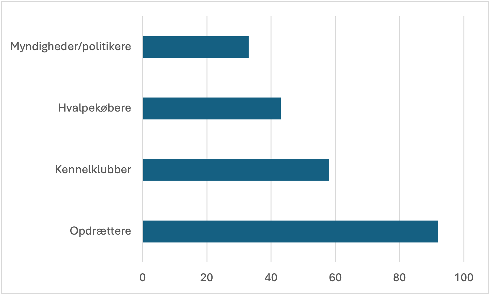Adspurgt om, hvor ansvaret for sund hundeavl primært skal placeres, svarer dyrlægerne, at det skal ligge hos henholdsvis myndigheder, dernæst hvalpekøbere, kennelklubber og i højeste grad hos opdrættere (figur 2).