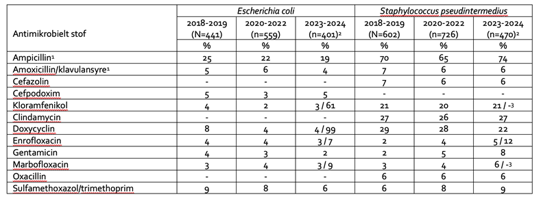 Det er værd at bemærke, at der over årene er en svag tendens til faldende resistens over for ampicillin og sulfamethoxazol/trimethoprim, som repræsenterer de antimikrobielle produkter, der anbefales i Danmark som førstevalg til urinvejsinfektioner hos hunde og katte. I S. pseudintermedius anvendes oxacillin som indikator for påvisning af MRSP. I alle tre tidsperioder var 6 % af S. pseudintermedius oxacillinresistente, hvilket indikerer et stabilt lavt niveau af MRSP. Et andet antibiotikum, der er værd at nævne for hunde, er clindamycin, da dette er det anbefalede første systemiske valg til hudinfektioner hos denne art. Niveauet af clindamycinresistens på 27 % er ikke lavt, men på linje med tidligere år. Det er vigtigt at bemærke, at resistensen over for dette lægemiddel tidligere har vist sig at være meget lavere (omkring 14 %) i danske isolater fra førstegangs-pyodermi hos hunde. Dette indikerer bias, sandsynligvis på grund af indsendelse af prøver fra patienter, der tidligere er blevet behandlet med antibiotika.